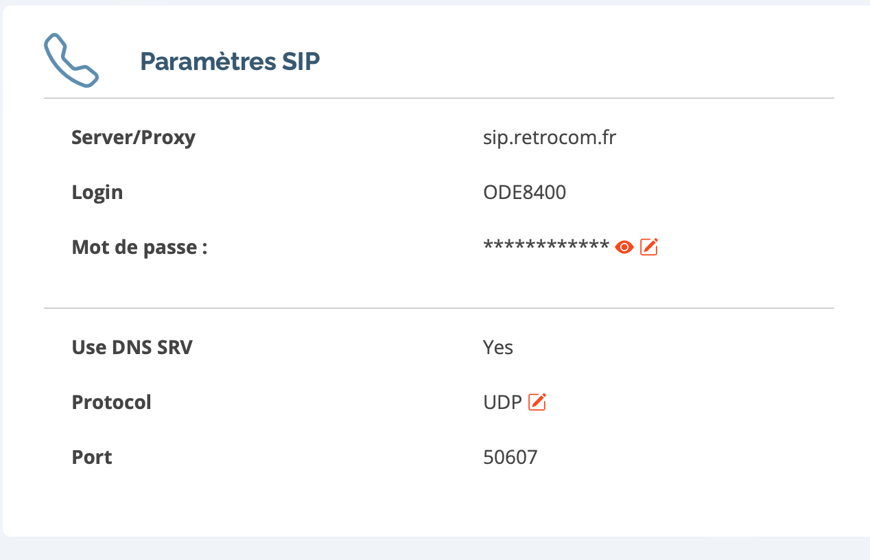- Munissez vous des identifiants de votre ligne, disponibles sur la page paramètres SIP du numéro concerné :