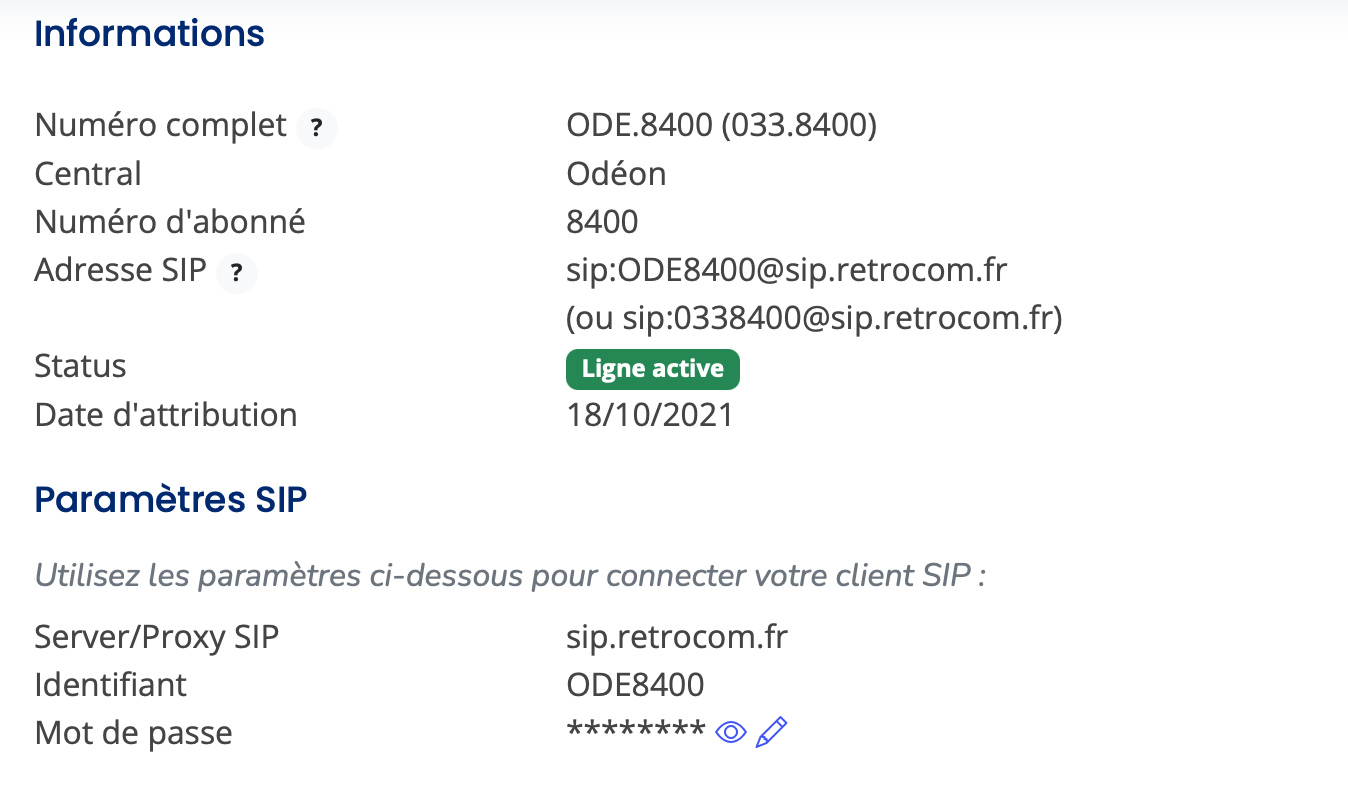 - Munissez vous des identifiants SIP de votre ligne, disponibles sur la page paramètres SIP du numéro concerné :